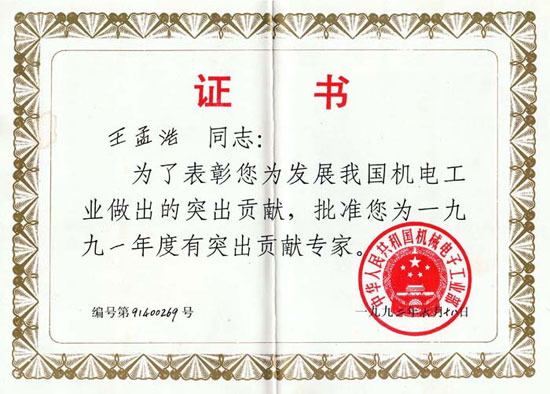 中華人民共和國(guó)有突出貢獻(xiàn)專(zhuān)家證書(shū)